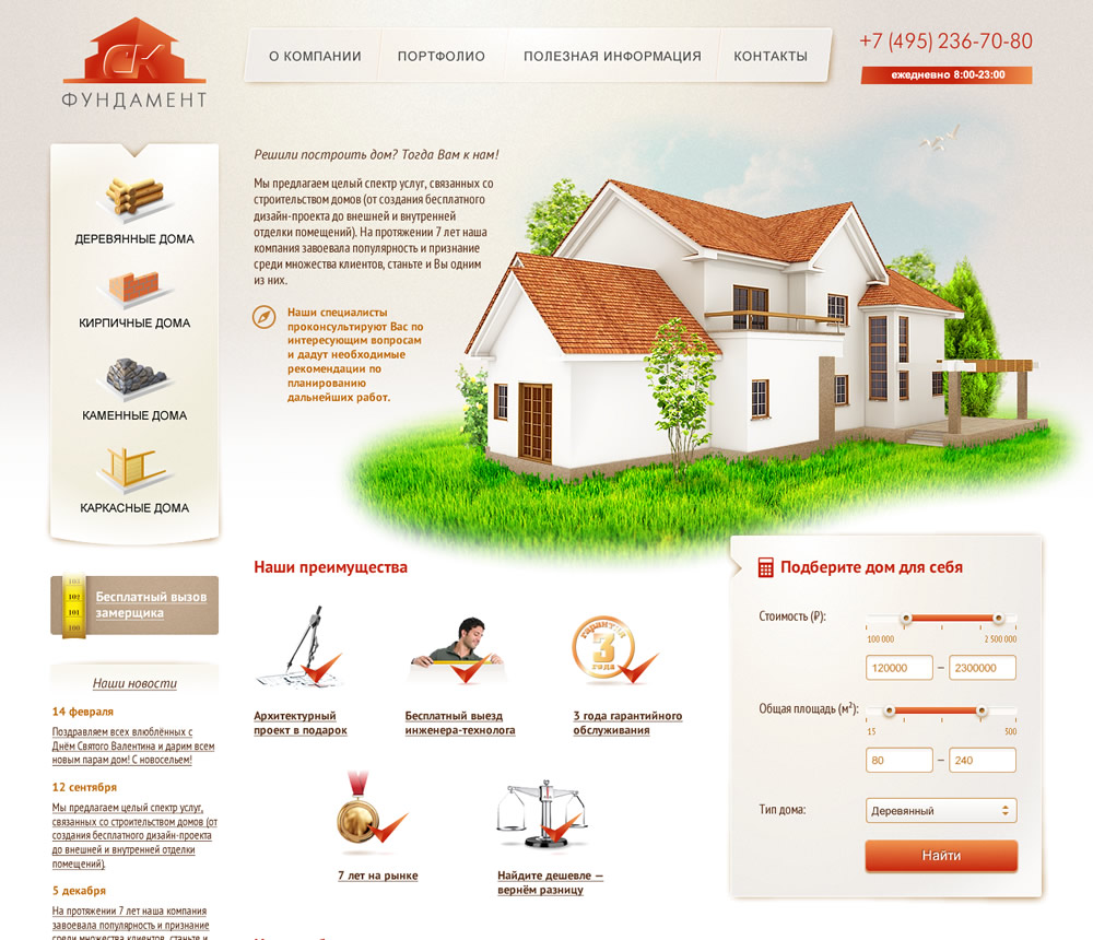Дизайн сайта для компании СК-Фундамент, оказывающей полный спектр услуг по строительству и дизайну домов.