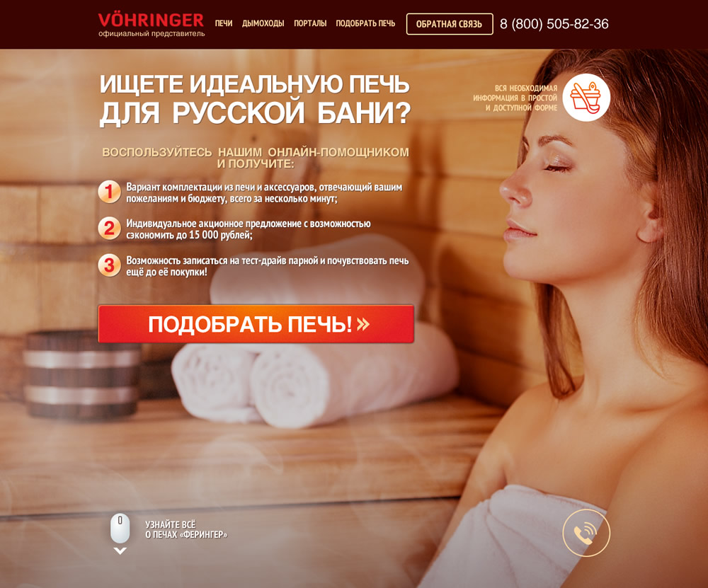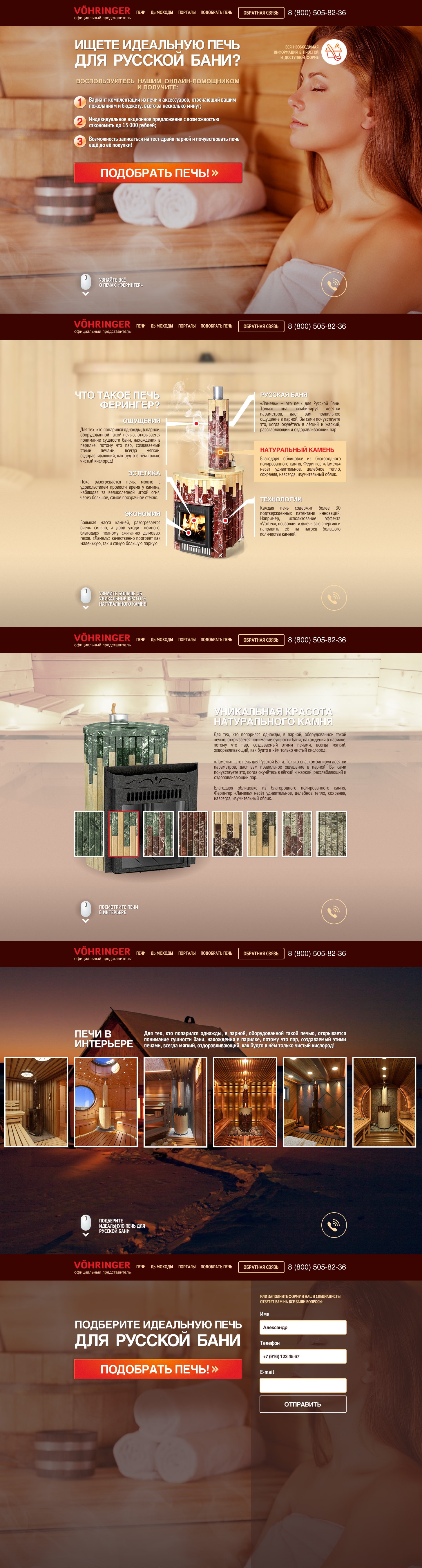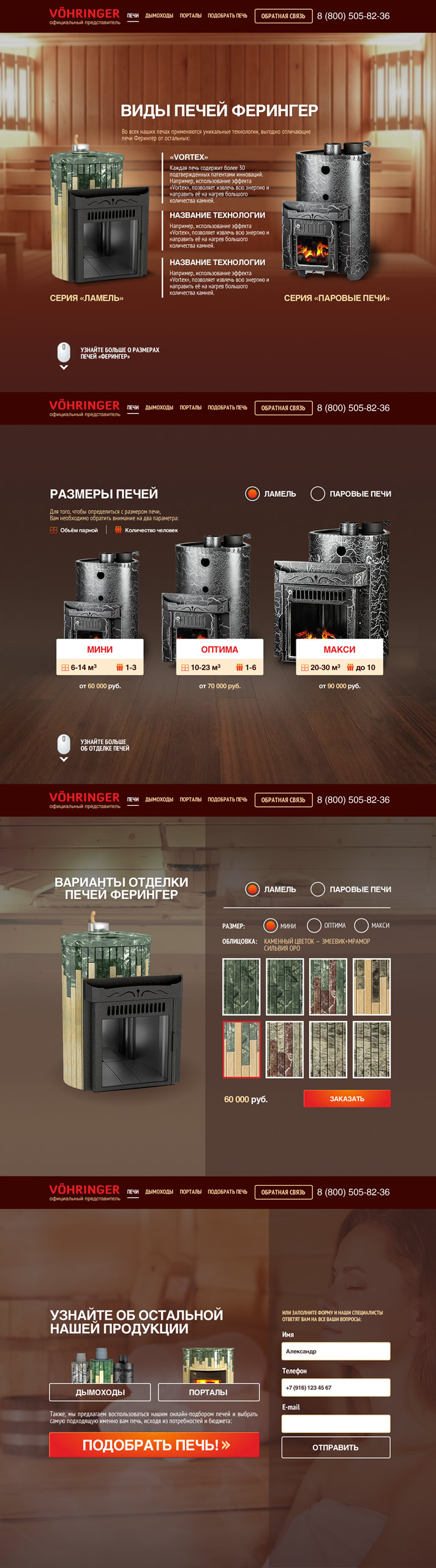 Промо-сайт для печей и аксессуаров «Ферингер» должен был совмещать в себе одновременно привлекательность и понятную инфографику, присущую Landing page, и, в тоже время, включать в себя различные посадочные страницы для категорий продукции, а кроме того — максимально доступную для любого пользователя систему подбора печи вместо объёмного и сложного каталога продукции этого немецкого производителя.