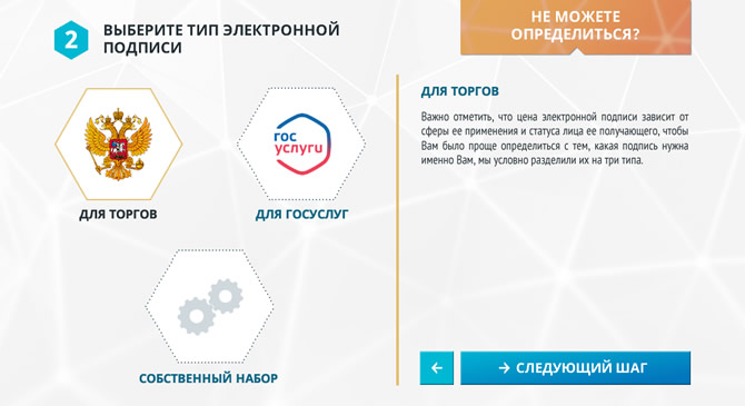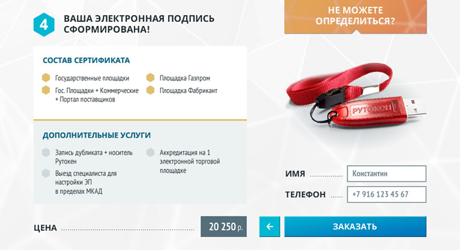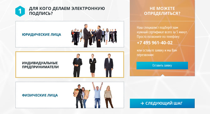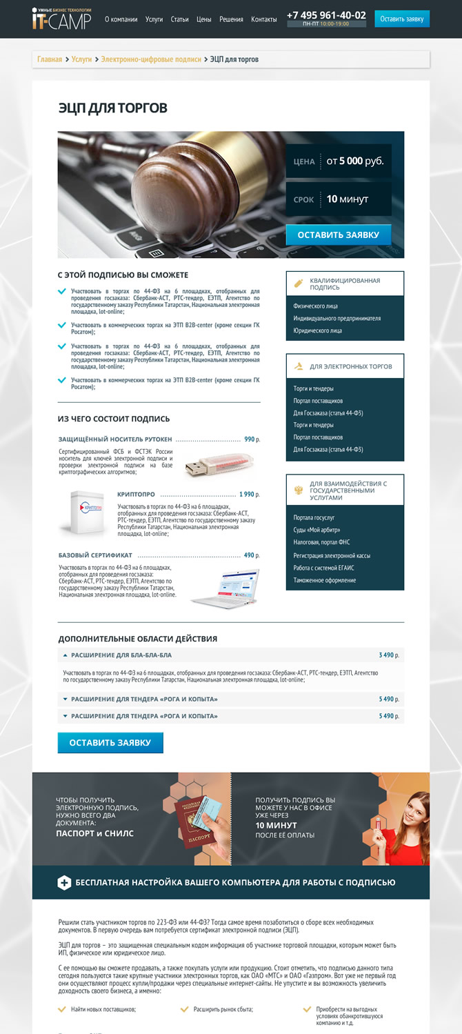 При разработке дизайна сайта использовался индивидуальный контент для каждой из услуг, поскольку необходимо было обеспечить маркетинговую привлекательность при прямом переходе на страницы из поисковиков — например, блок расчёта и заказа для услуги выпуска ЭЦП и т.п.